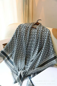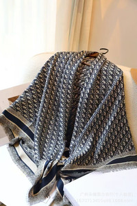 秋冬新款D字母真丝羊毛方巾双面两用围巾老花高端百搭海军蓝披肩