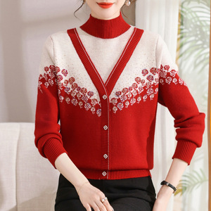妈妈秋冬加厚针织小衫洋气假两件上衣一体绒女冬装加绒毛衣打底衫