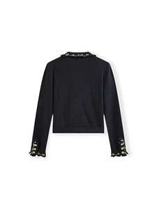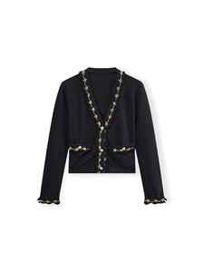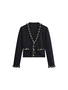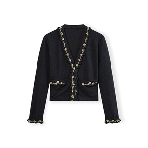 【璀璨饰边】经典V领黑色针织开衫 口袋镶钻花朵装饰尽显高贵气质