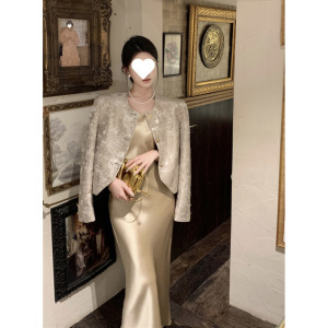 秋装美拉德穿搭提花料小香风外套+醋酸缎面显瘦吊带连衣裙女