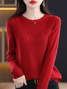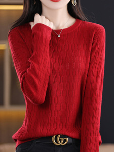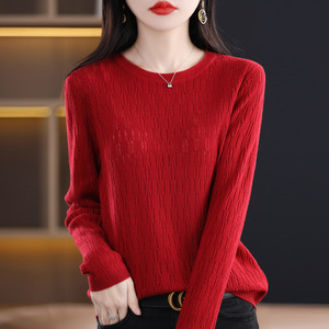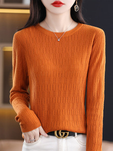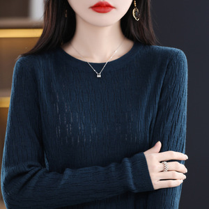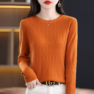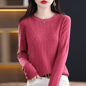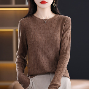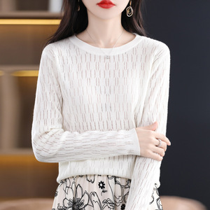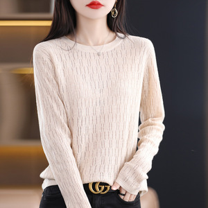 秋冬新款镂空提花羊毛圆领长袖针织打底衫女通勤百搭针织上衣