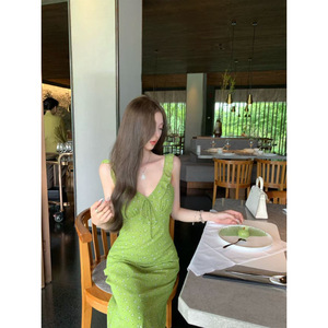 法式碎花荷叶边V领吊带绿色连衣裙女夏新款大码胖MM显瘦度假长裙