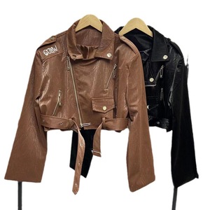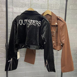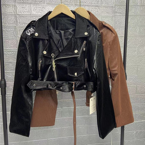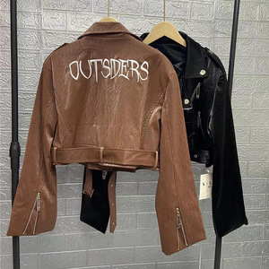 美式重工刺绣收腰系带机车PU皮衣外套女秋季新款复古皮夹克上衣短