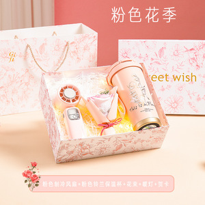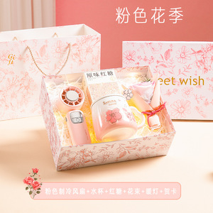 粉色制冷风扇+粉色铃兰保温杯+红糖+花束+暖灯+贺卡