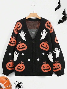 欧美跨境2025新款万圣节V领宽松南瓜提花开衫针织毛衣外套亚马逊
