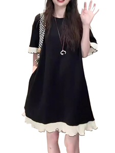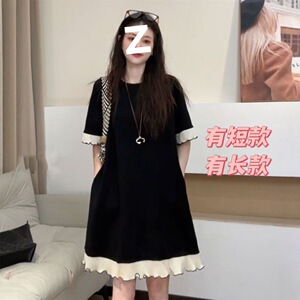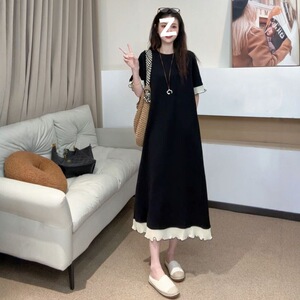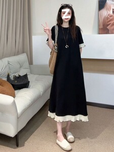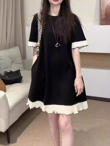 女性のための黒のレースの半袖ドレス夏 2025 大きいサイズファット mm スリムウエスト気質女性のための A ラインロングスカート