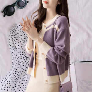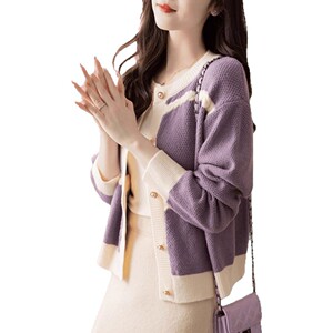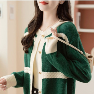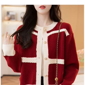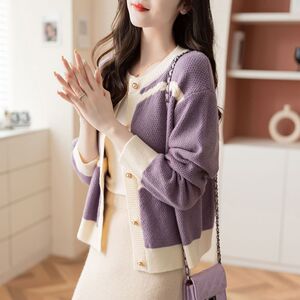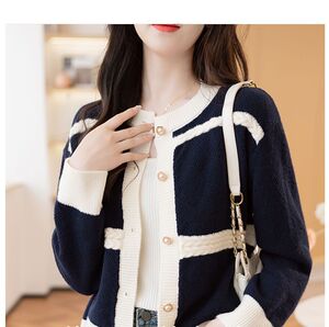 新款时尚新款小香风针织毛衣外套女圆领拼色短款针织衫女上衣潮