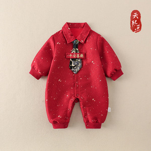 婴幼儿衣服春秋款红色连体衣满月周岁百天男宝宝双层哈衣外出爬服