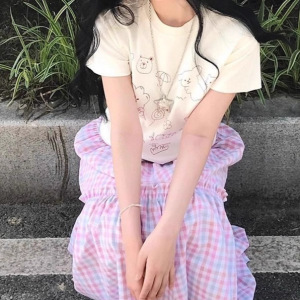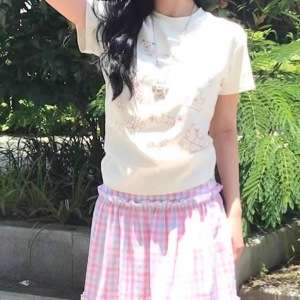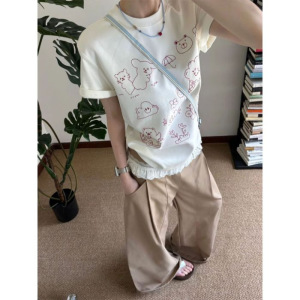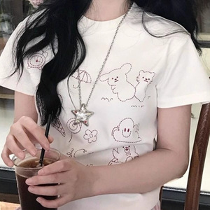 2025新款气质ins户外美式复古季涂鸦印花白色正肩短袖t恤女夏上衣
