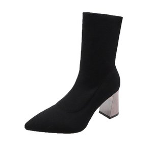 2025新款黑色英伦风高跟袜子靴尖头针织时装短靴女粗跟大码弹力靴