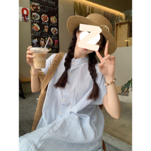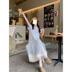 蓝色条纹短袖衬衫连衣裙女夏季2025新款韩系宽松中长款叠穿两件套