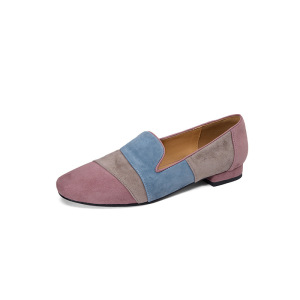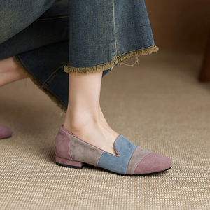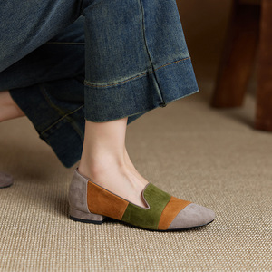 真皮磨砂拼色乐福鞋女款2025新款春秋女鞋一脚蹬翻毛皮软底单鞋女