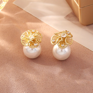 金色花朵珍珠锆石耳钉(S925纯银针)