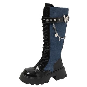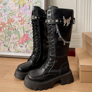 2025秋季新款欧美潮搭长筒靴金属蝴蝶链条小众高筒靴厚底骑士靴女
