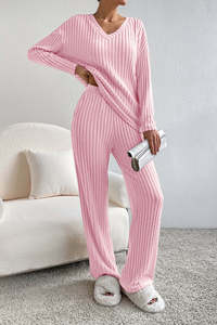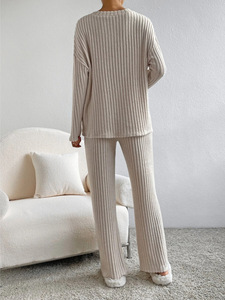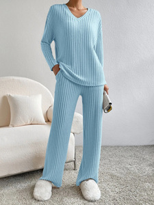 2025 秋の新クロスボーダーツーピースセットレディースファッションカジュアルストレートパンツ気質ルーズ V ネックピットストリップニットセット