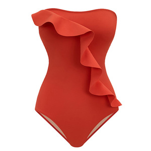 ヨーロッパとアメリカの赤いワンショルダーフリルワンピース水着スリムカットホリデービーチ目を引くセクシーなチューブトップ水着女性用
