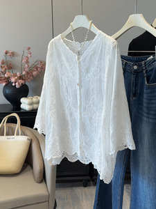 韓国レースジャカード刺繍七分袖シャツ女性用夏の見栄えの良いファッショナブルな年齢を軽減するルーズでシックな日焼け止めトップ