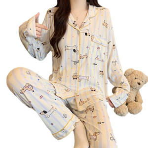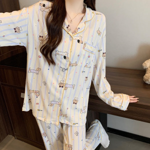 韩系高颜值ins风条纹小狗皱布睡衣女春秋季家居服套装可外穿批发