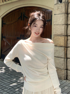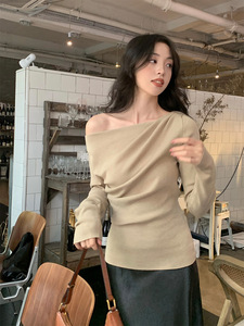 SYT小露香肩 一字领针织衫女秋季荡领显瘦复古T恤斜切领长袖上衣