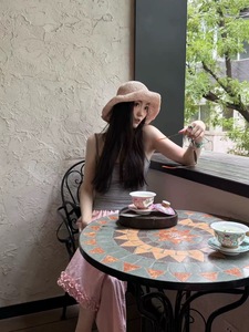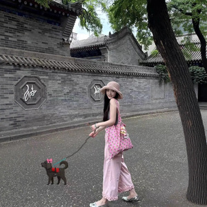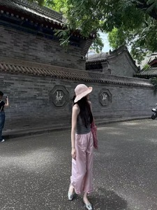 韩系穿搭灰色百搭吊带背心修身无袖木耳花边拼接高腰阔腿裤两件套