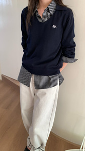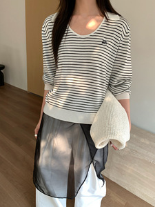 TG 韩版休闲条纹U领套头针织POLO衫女2025秋季新款长袖毛衣25504
