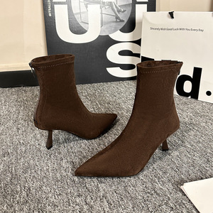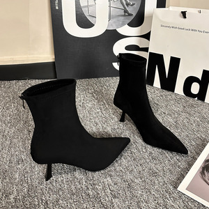 尖头细低跟短筒马丁靴2025秋冬新款韩版绒面百搭弹力瘦瘦靴后拉链