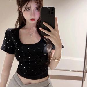 ins韩国方领显胸大紧身t恤女士春夏天烫钻短款露脐小个子辣妹上衣