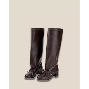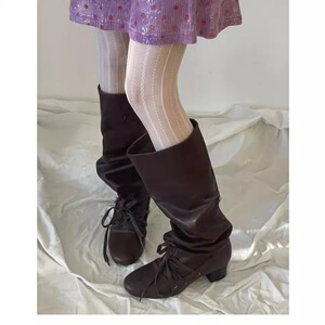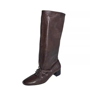 圆头粗跟高筒小众系带堆堆靴子女2025秋季新款真皮韩版长筒骑士靴