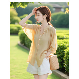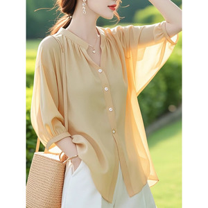 T5C ユニークで美しい小さなシャツ、ゆったりしていてお腹をカバーする、女性用の黄色のシフォンシャツ、夏の妖精のようなスタイル、七分袖スタイル