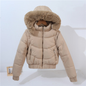 欧美女装可脱卸袖两穿短款修身高腰棉服外套休闲加厚毛领加绒棉衣
