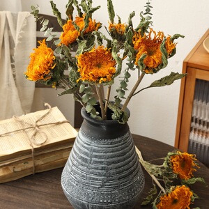 テディひまわり 5 個 + セメントグレーの土鍋 + 乾燥ユーカリの葉 5 個