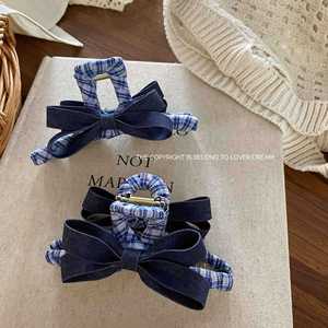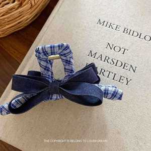 韩国新款牛仔布艺蝴蝶结蓝色格纹发夹时尚抓夹绕布鲨鱼夹头饰发饰