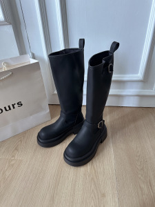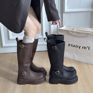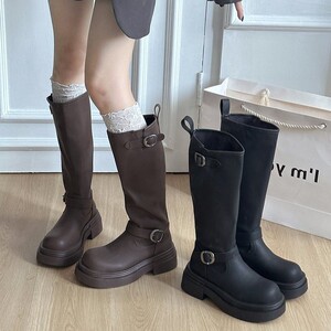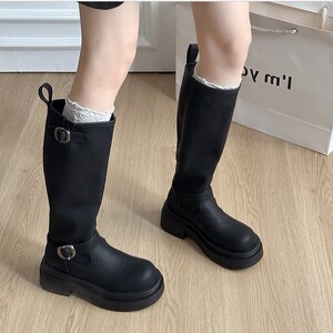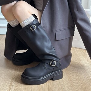 ブラックベルトバックルブーツレディースストレッチブーツ2025秋冬新スタイル身長を伸ばしてスリムに見せる膝丈レディースブーツ
