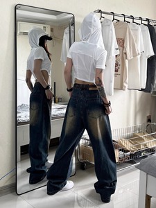 复古做旧水洗牛仔裤男春秋美式高街宽松拖地裤子潮牌百搭大码长裤