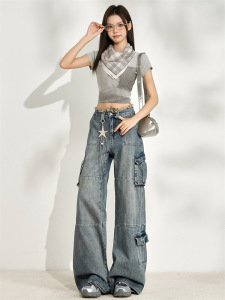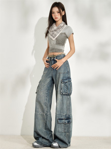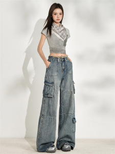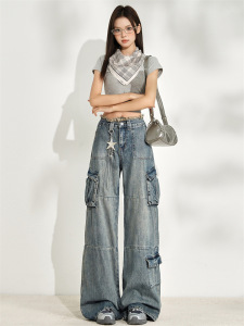 美式复古高街毛边腰头牛仔裤女2025秋宽松显瘦多口袋工装阔腿裤