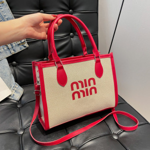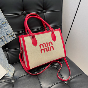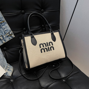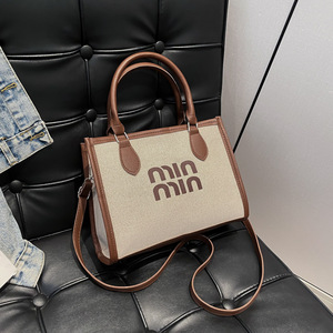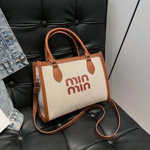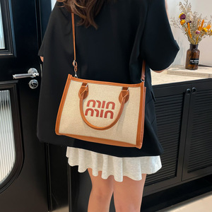 休闲通勤手提托特包女2025跨境外贸新款简约亚麻布撞色单肩斜挎包