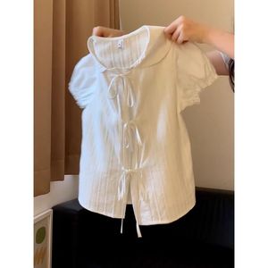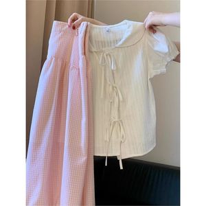 夏日减龄穿搭一整套蝴蝶结系带衬衫女学生搭配粉色格子高腰半身裙