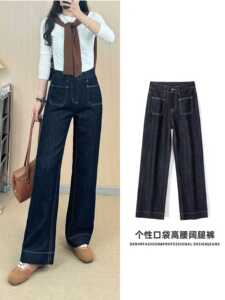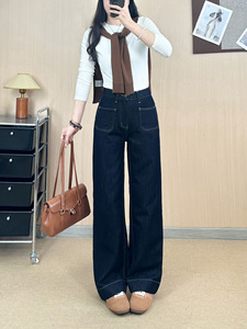 佳伟窄版阔腿牛仔裤女秋季新款高腰独特口袋宽裤脚直筒长裤2025