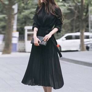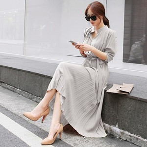 雪纺长袖百褶连衣裙2025春秋新款修身收腰显瘦韩范名媛气质百褶裙