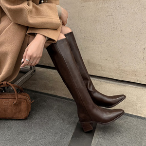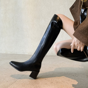 显瘦方头粗跟过膝长靴女高跟真皮宽筒靴女平口高妹骑士靴及膝靴潮