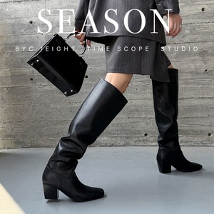 5cm欧美风百搭纯色方头粗跟高筒靴女牛皮简约一脚蹬牛筋底时装靴
