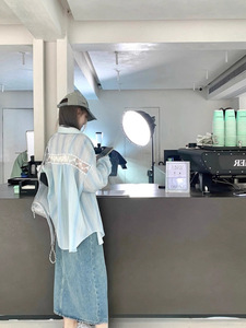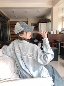 ブルーレースステッチ日焼け止めシャツジャケット女性の夏の小さなシャツカーディガンルーズ長袖トップ