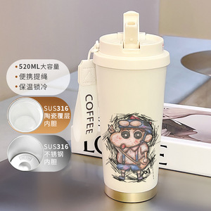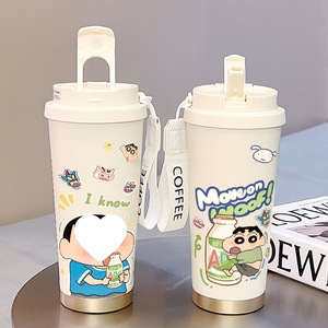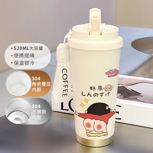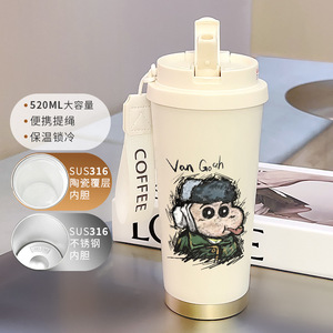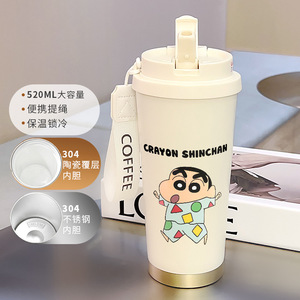 果盈卡通小新保温杯吸管大容量水杯子男女款高颜值咖啡杯儿童学生