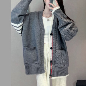 2025春秋慵懒风V领女装针织开衫双拼麻花撞色大开衫中长款毛衣女