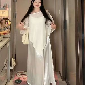 プラスサイズ 150kg 気質ブラウスサスペンダードレスツーピースセット女性の夏の新しいスタイルファットミリメートルカバー肉痩身スーツ