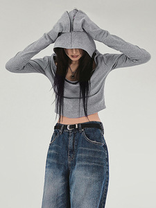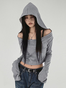 欧美风新款基础连帽废土T恤露肩设计显个性时尚灰色露脐长袖上衣