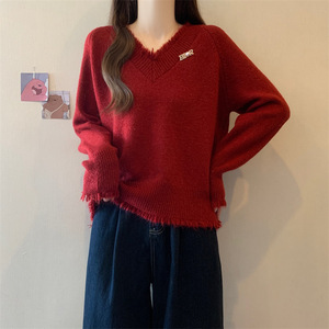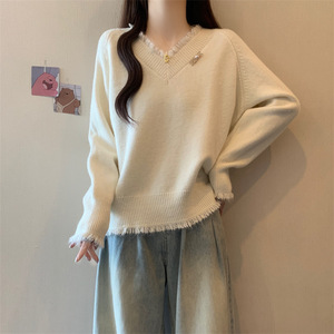 不规则磨破裁剪感V领毛衣女软糯韩系秋冬款慵懒风宽松针织衫上衣