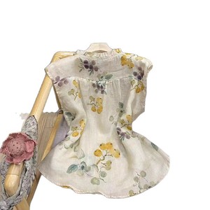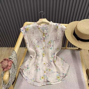 复古国风印花无袖棉麻小衫木耳领文艺百搭气质衬衫女