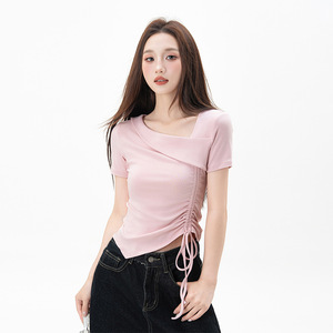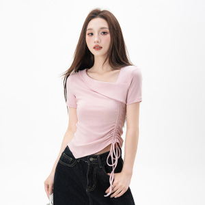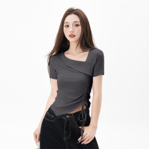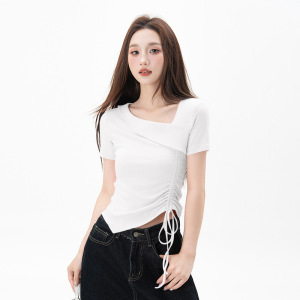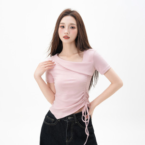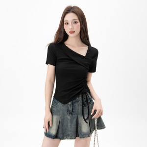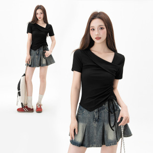 黑色不规则正肩短袖t恤女2025夏季新款抽绳收腰显瘦紧身打底上衣