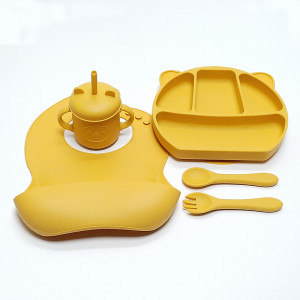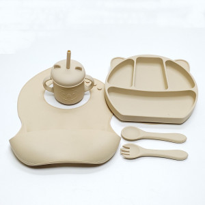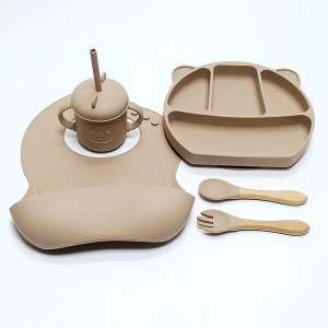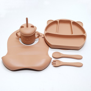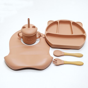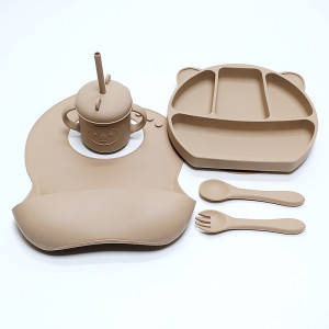 ライトブラウン(リトルベア 4コンパートメントシリコンプレート+カップ+よだれかけ+フルシリコン+スプーン+フォーク)